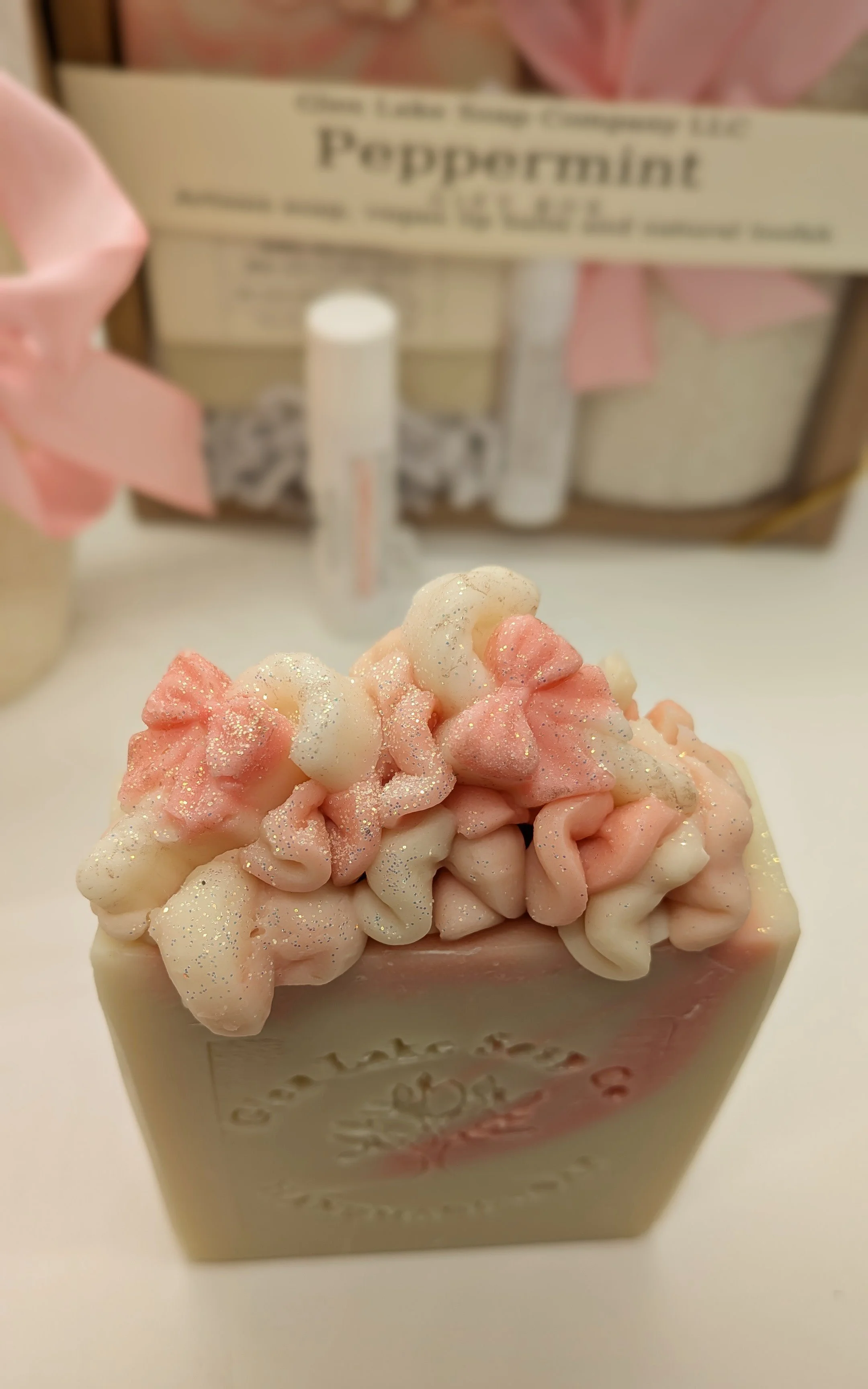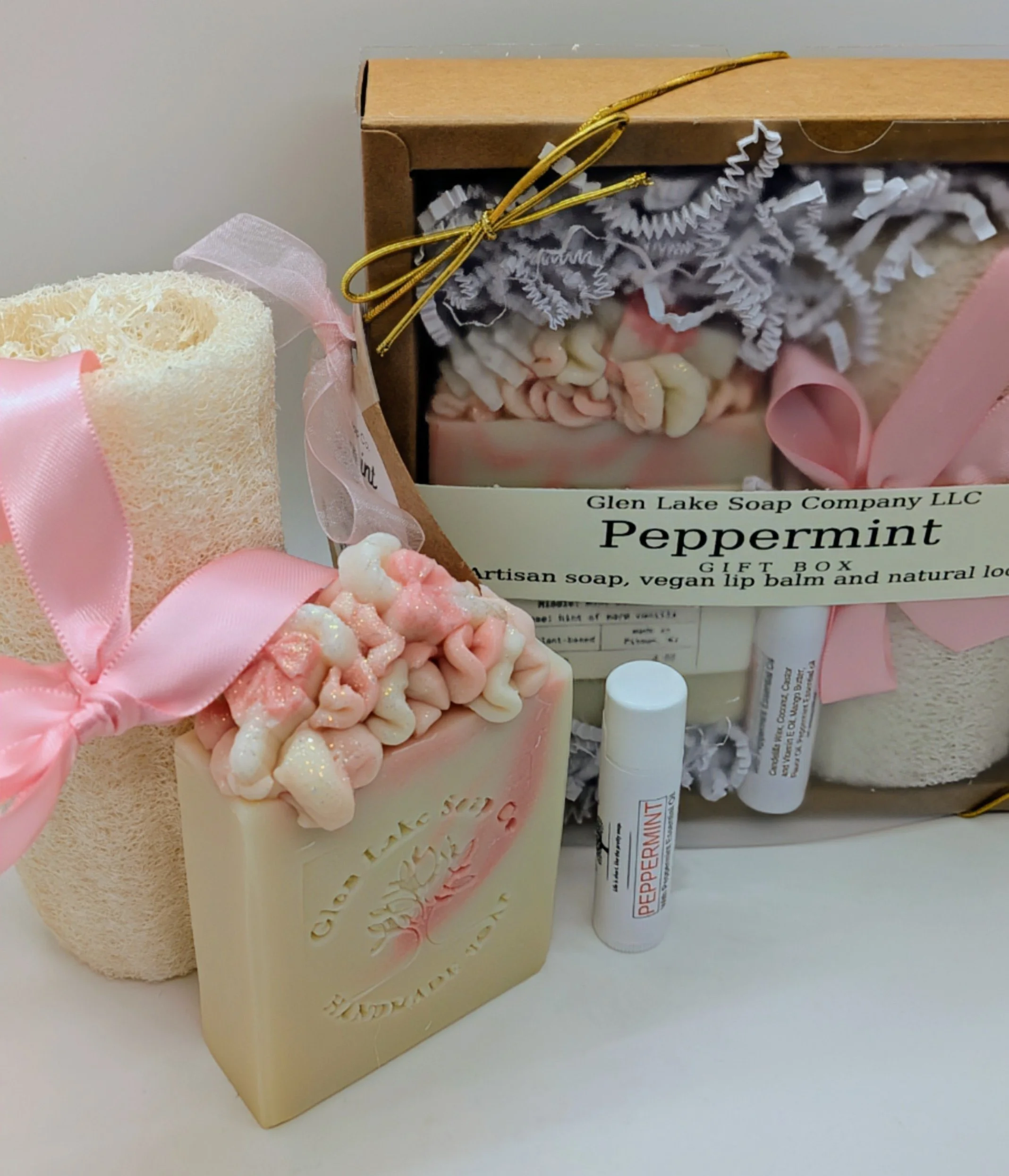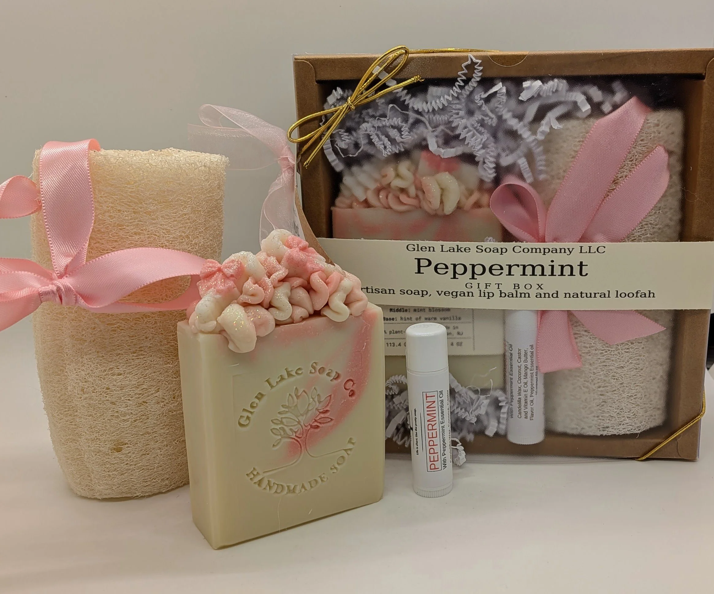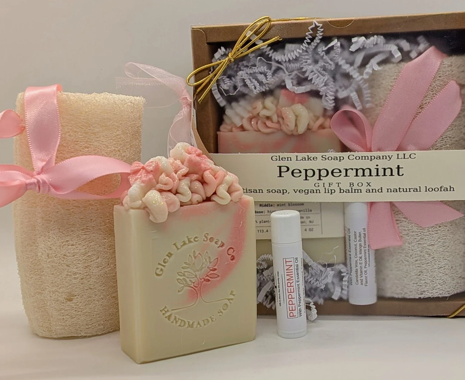 This pretty pink Peppermint gift set includes one artisan bar of plant based soap, one vegan lip balm and an all natural loofah with a pink bow. It is beautifully gift boxed.