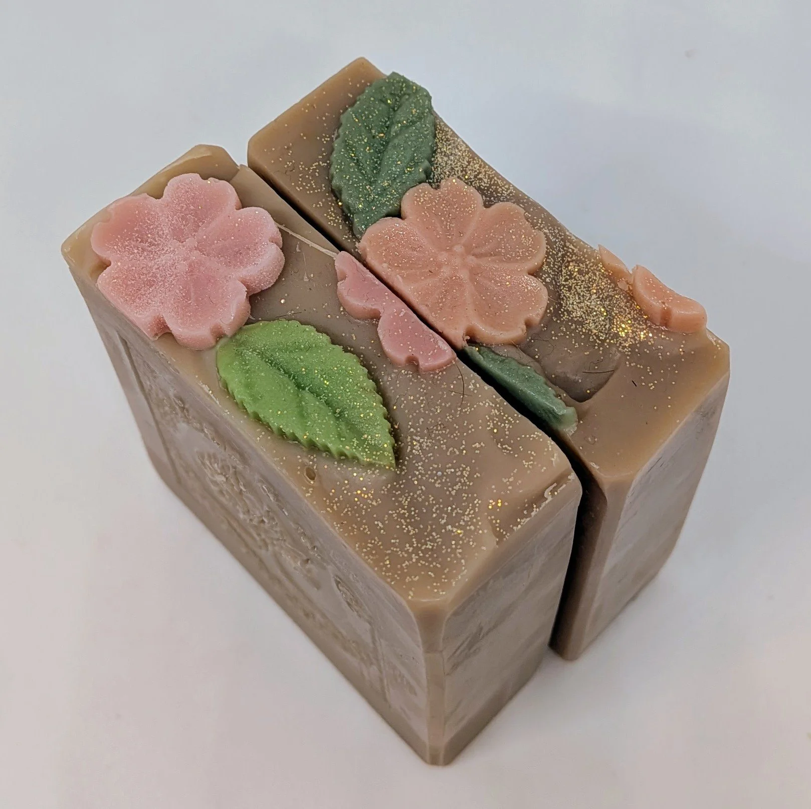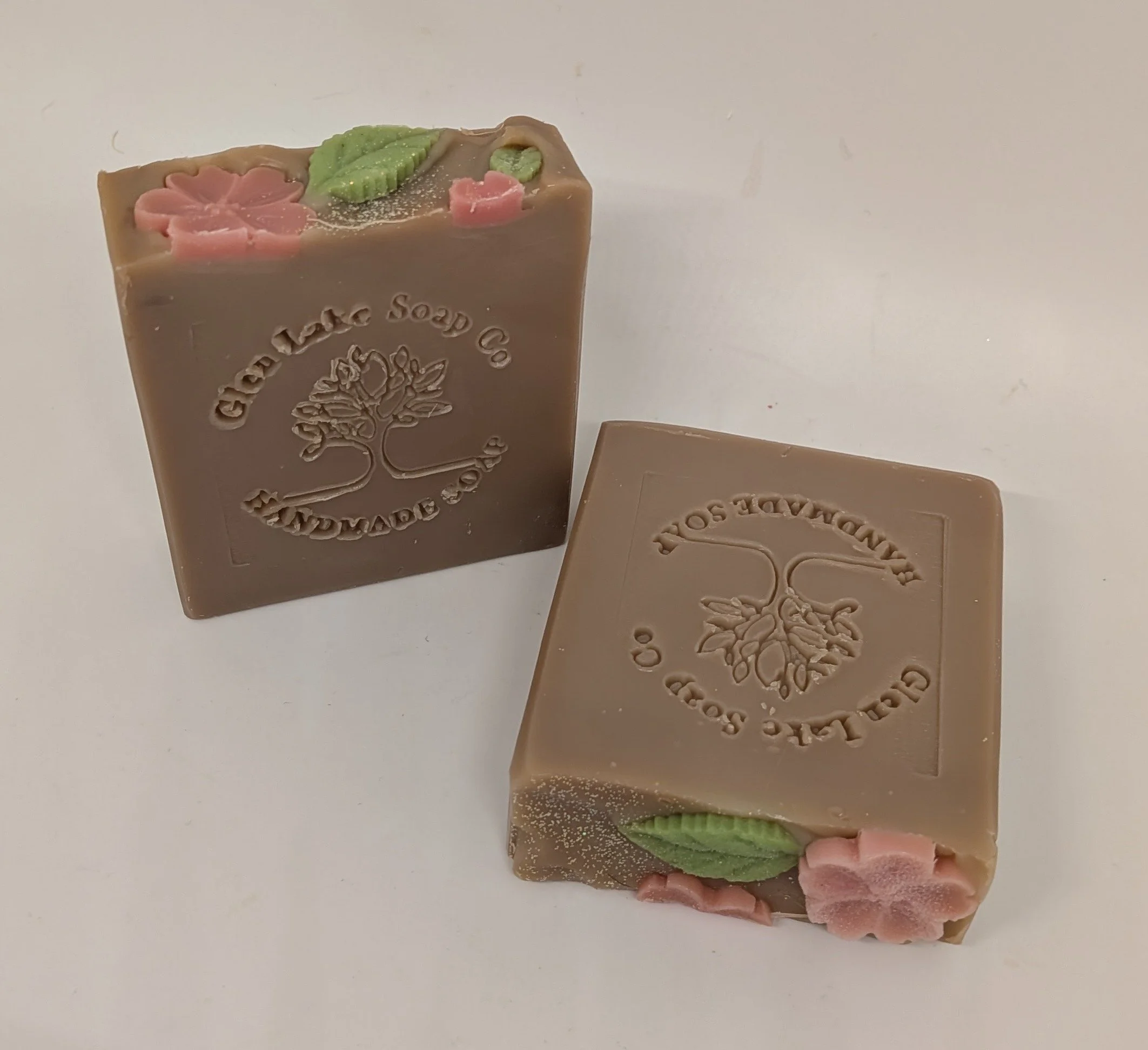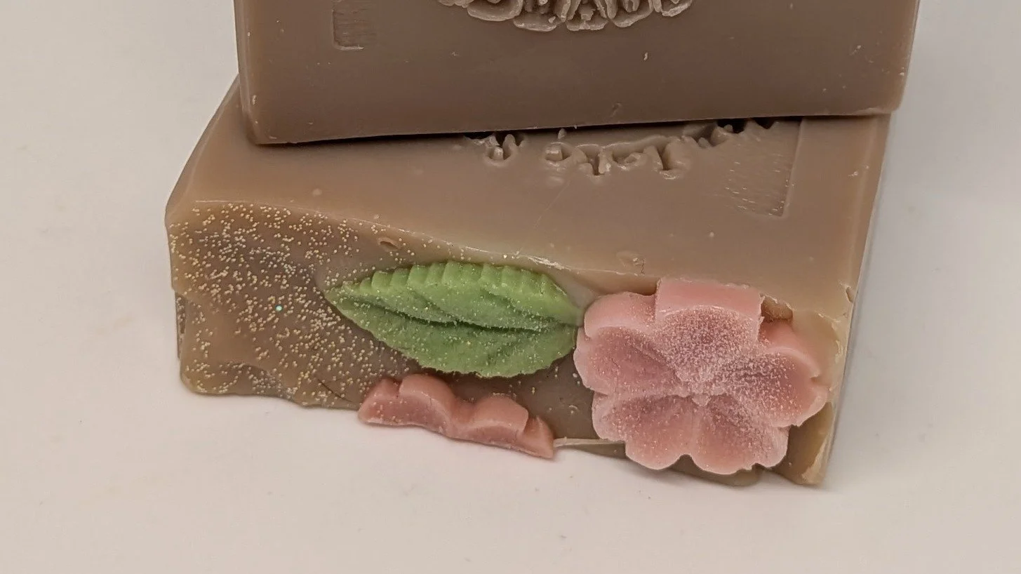 Our Cherry Almond Bar Soap has the aroma of juicy cherries, wild raspberries and sweet almonds with a middle note of cinnamon and vanilla. Each bar is topped with delicate pink cherry blossoms. All of our soap is made with the highest quality ingredients including olive oil, rice bran, Kaolin clay and mango butter.