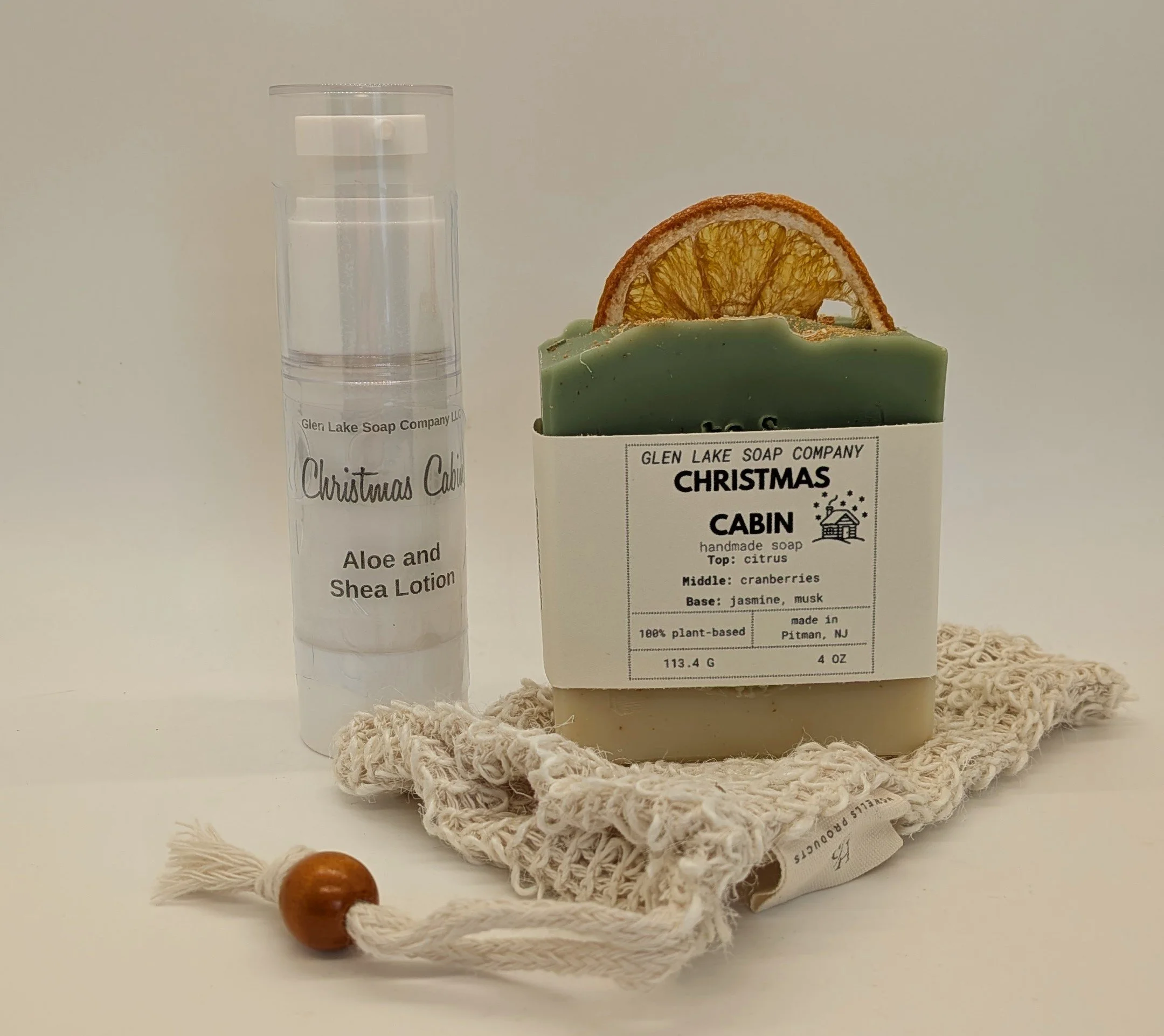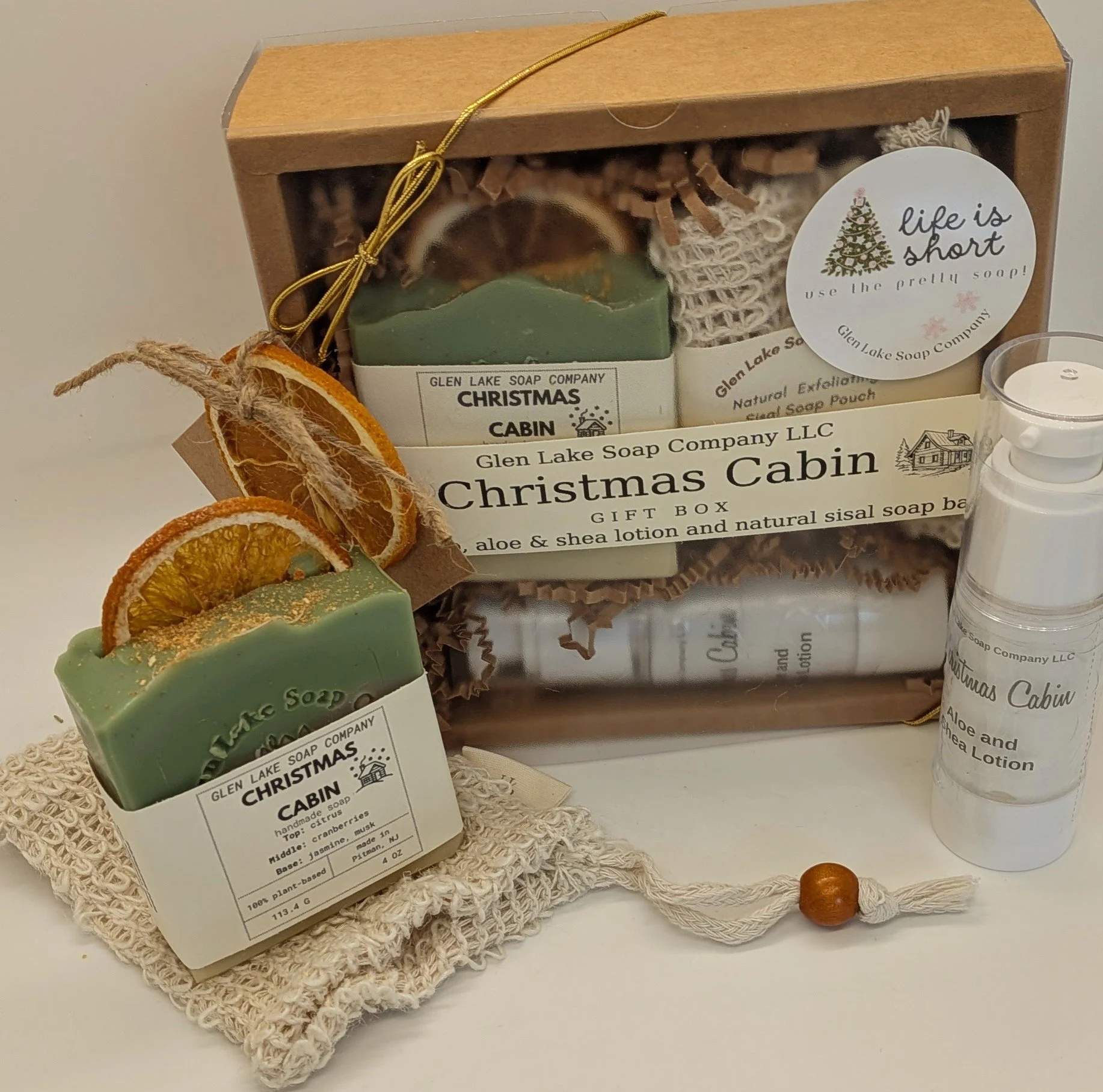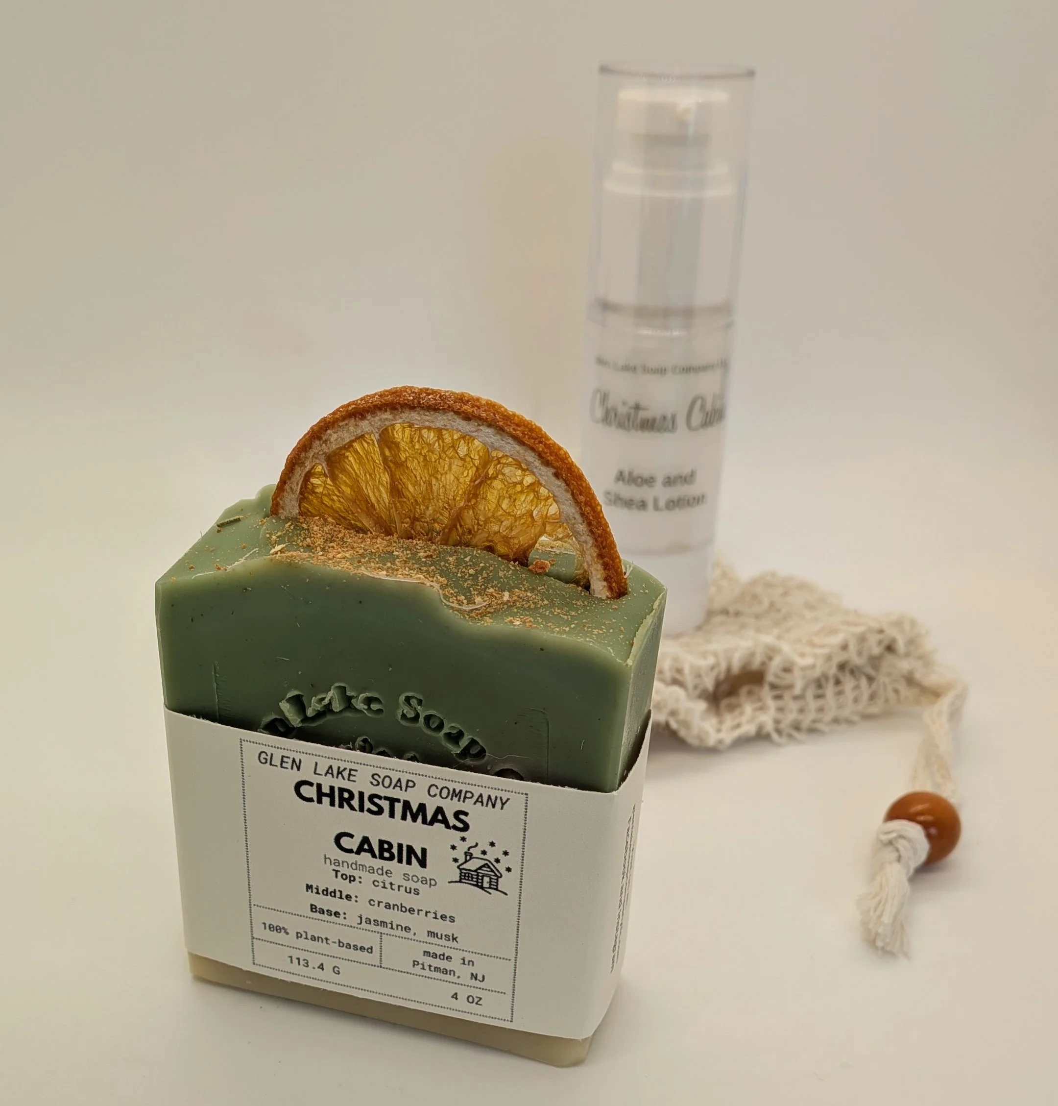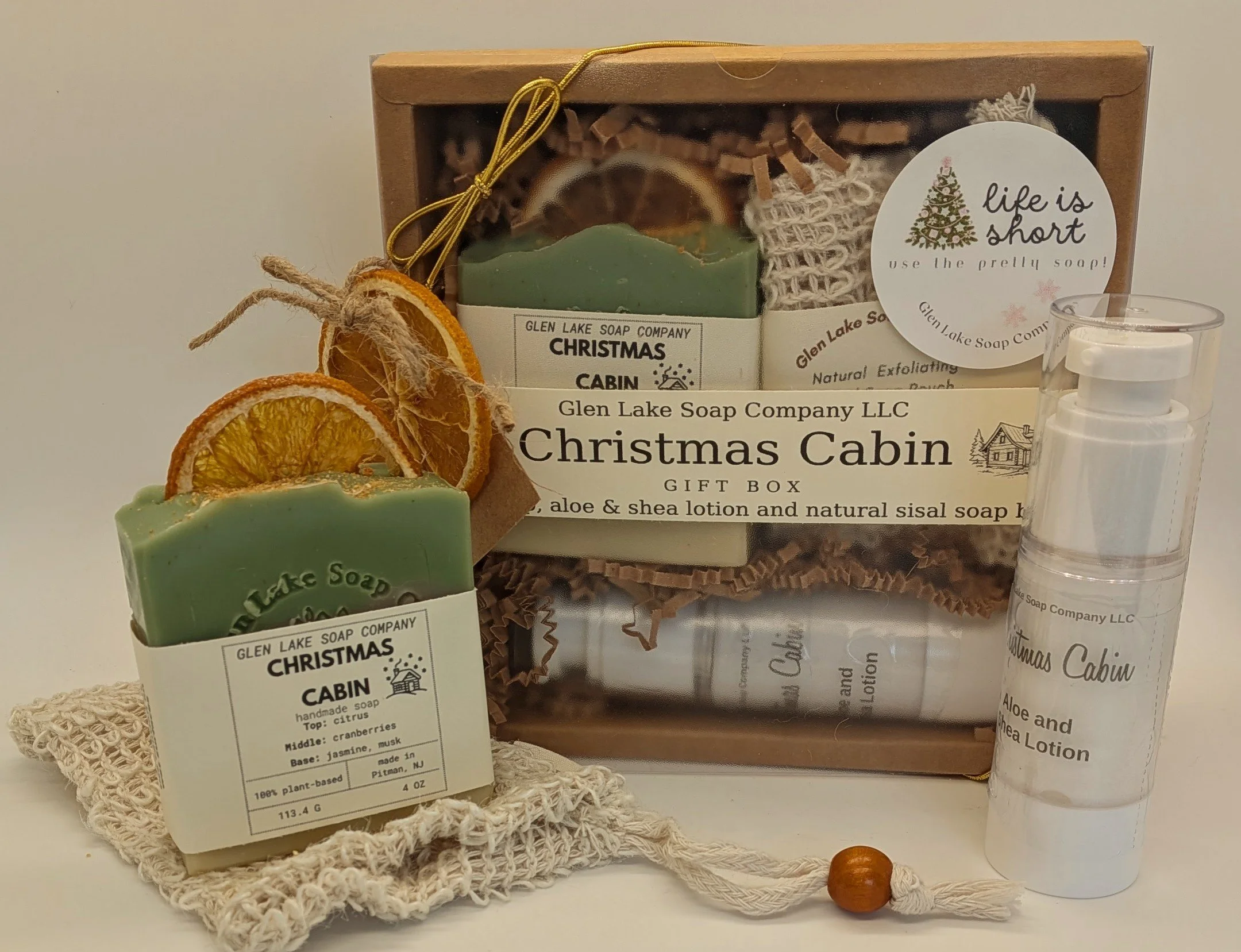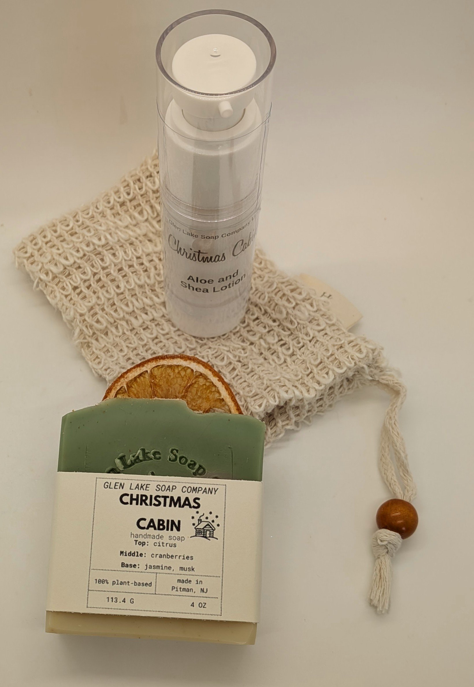 Our spicy and warm Christmas Cabin soap has the aroma of bright citrus, mixed with tart cranberries, sweet jasmine on a base of soft musk. This gift set includes one artisan bar of plant-based soap, one aloe and shea lotion in an airless pump bottle and a natural sisal soap bag. It is beautifully gift boxed and ready for giving.