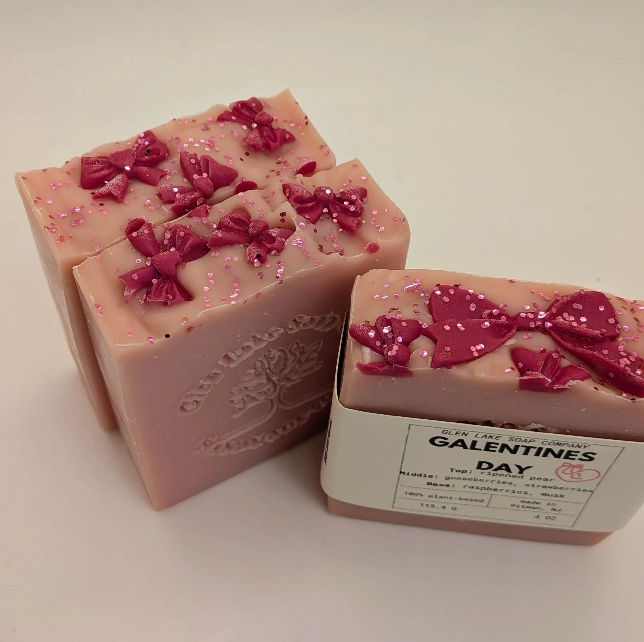 Our pretty and pink Galentine’s Day soap has the aroma of ripe pears, gooseberries, strawberries, raspberries and a little musk. Each bar is topped with soap dark pink soap bows and pink bio-degradable glitter. All of our soap is made with the highest quality ingredients including olive oil, rice bran and mango butter.