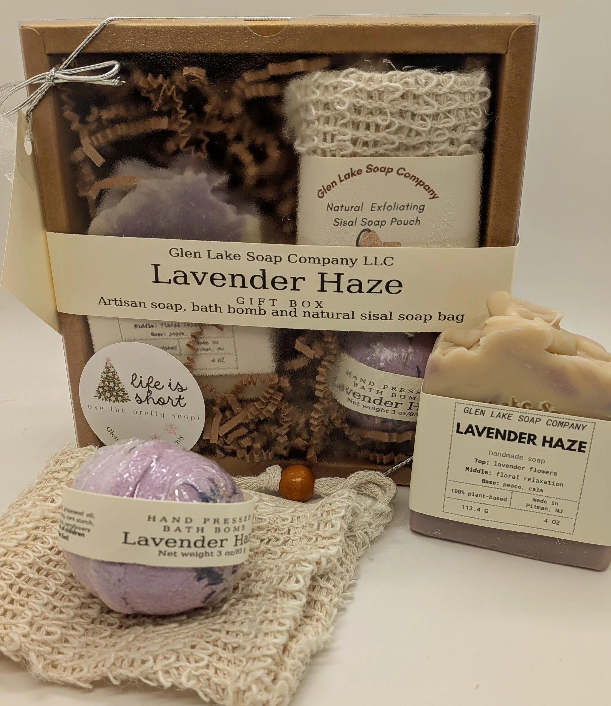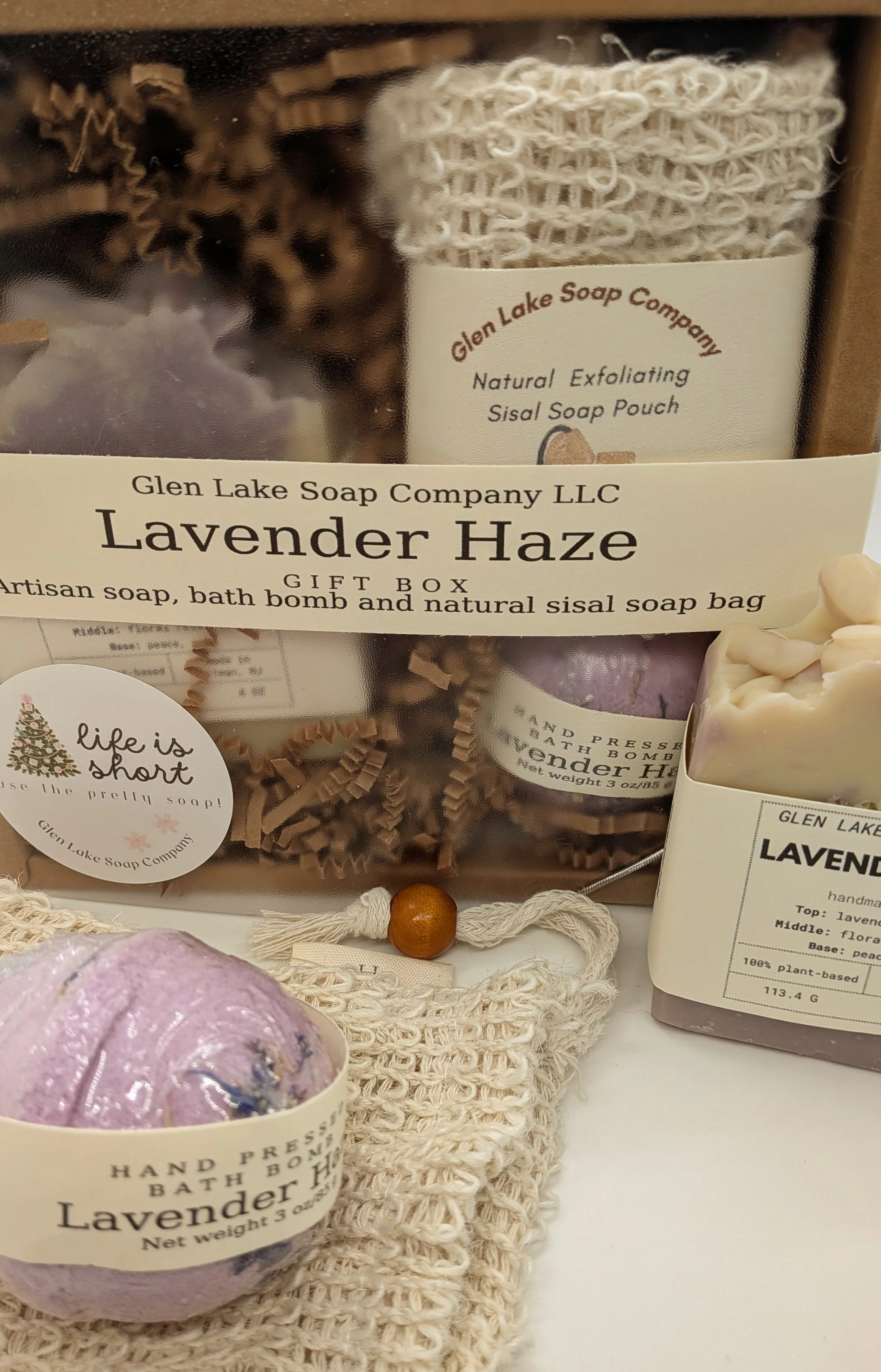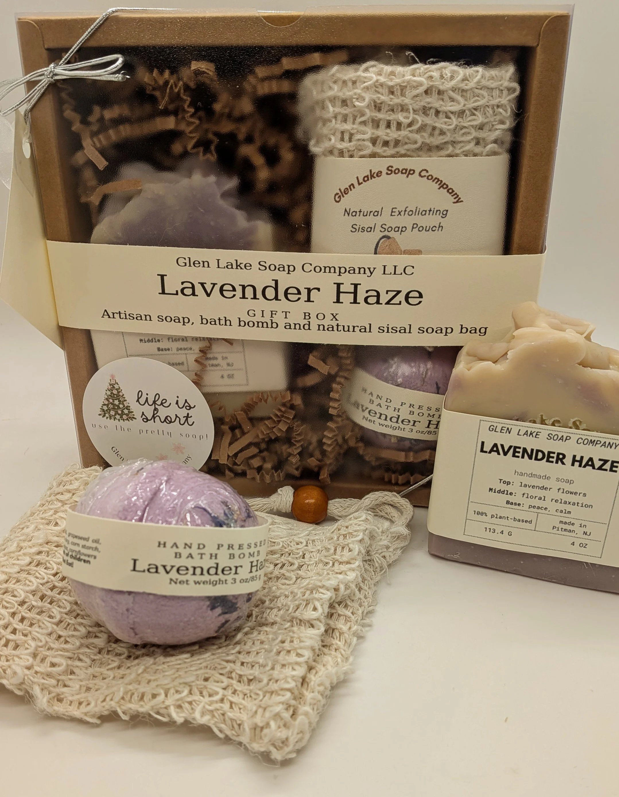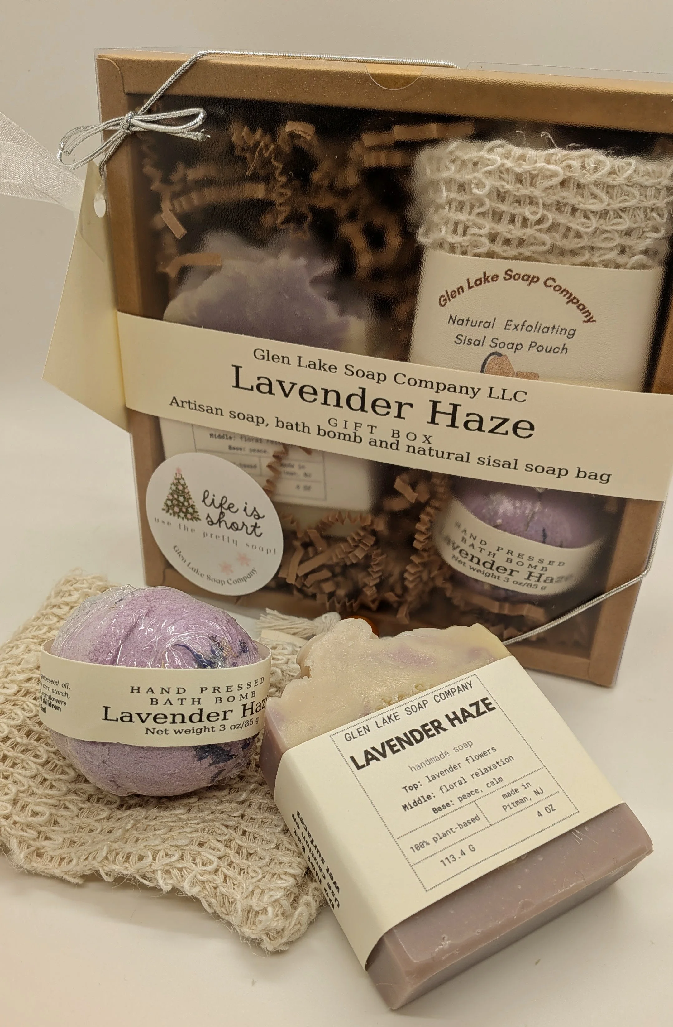 This pretty Lavender Haze gift set includes one artisan bar of plant-based soap, one hand-pressed bath bomb and an all-natural soap sisal bag. Our Lavender Haze has a beautiful mix of lavender blossoms and floral fragrance that is pretty and soft. It is beautifully gift boxed and ready for giving!