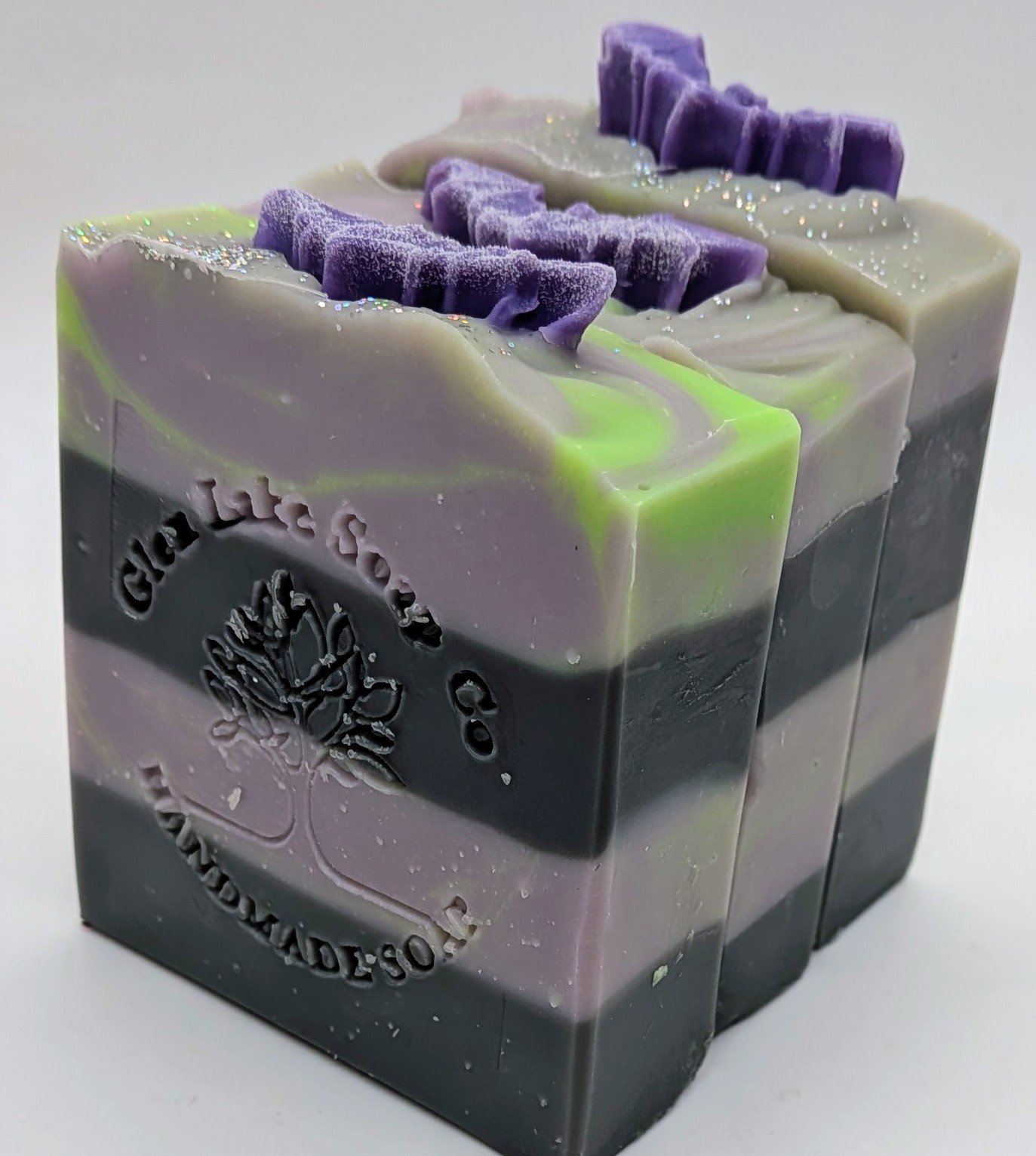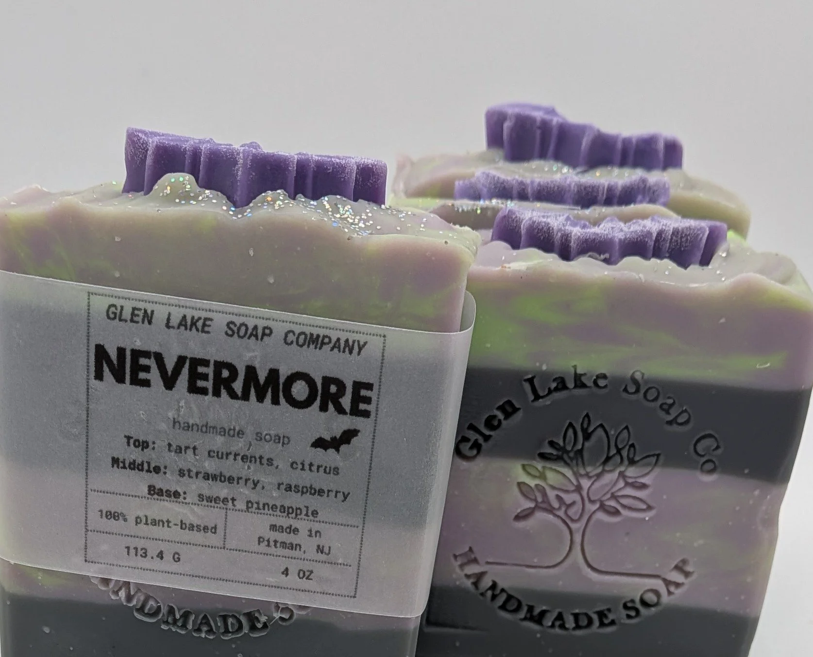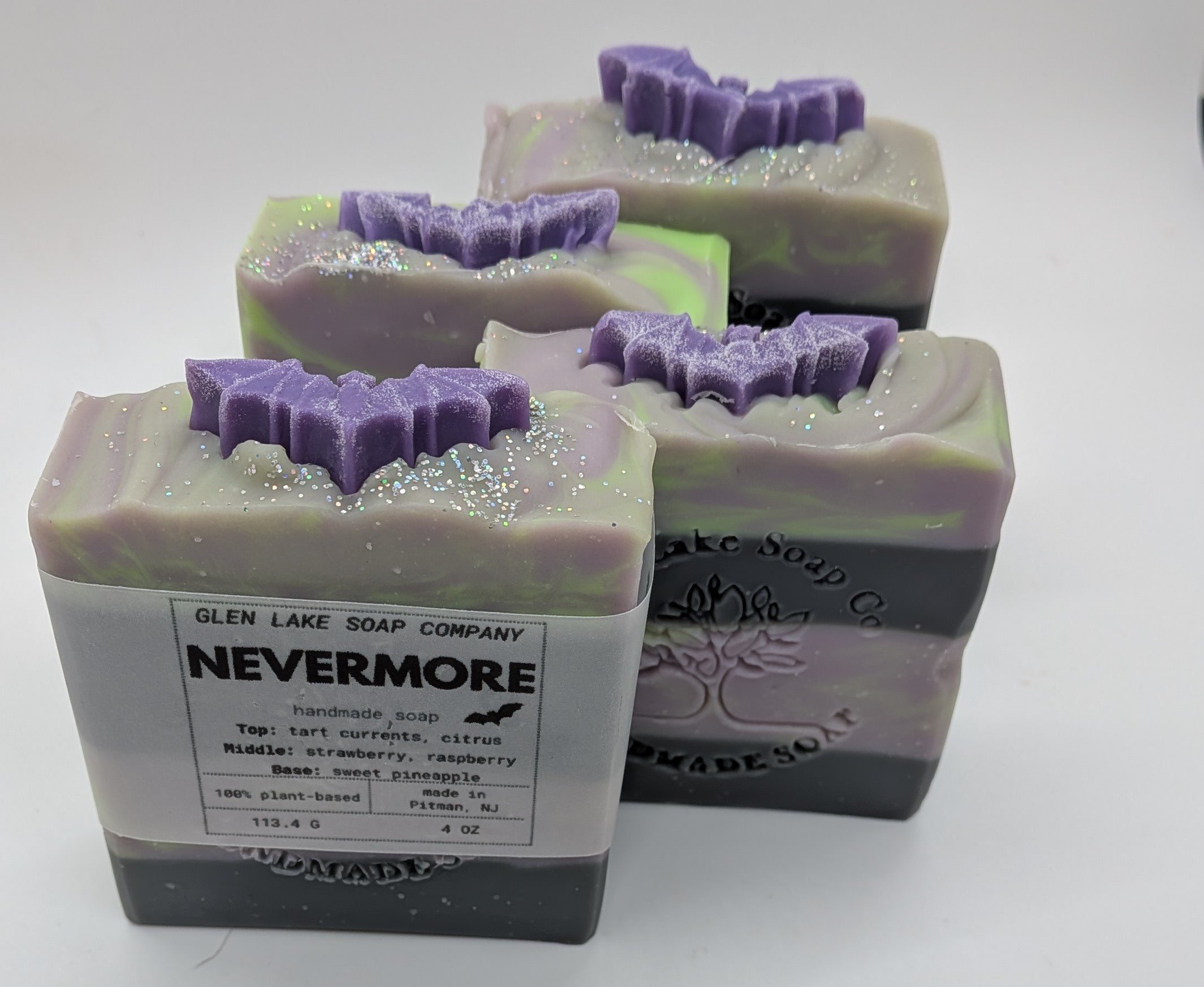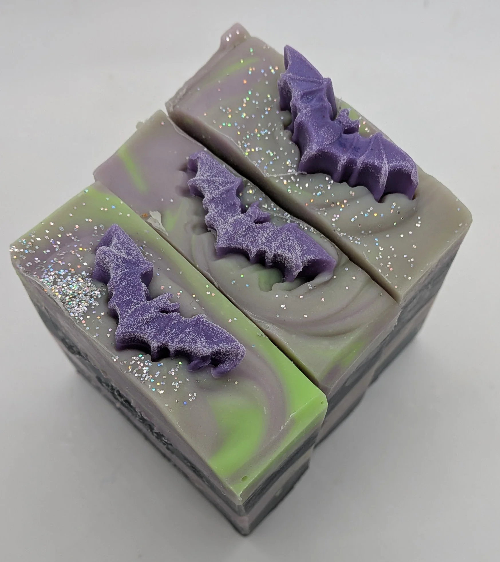Our Wednesday Addams themed handmade Nevermore bar soap is made with only plant-based ingredients. We have combined the earthy aroma of tart currants, citrus, strawberry, raspberry and sweet pineapple. Each bar is striped with grey and purple/green swirls and topped with a purple bat and biodegradable glitter. This bar is made with skin loving oils and kaolin clay.