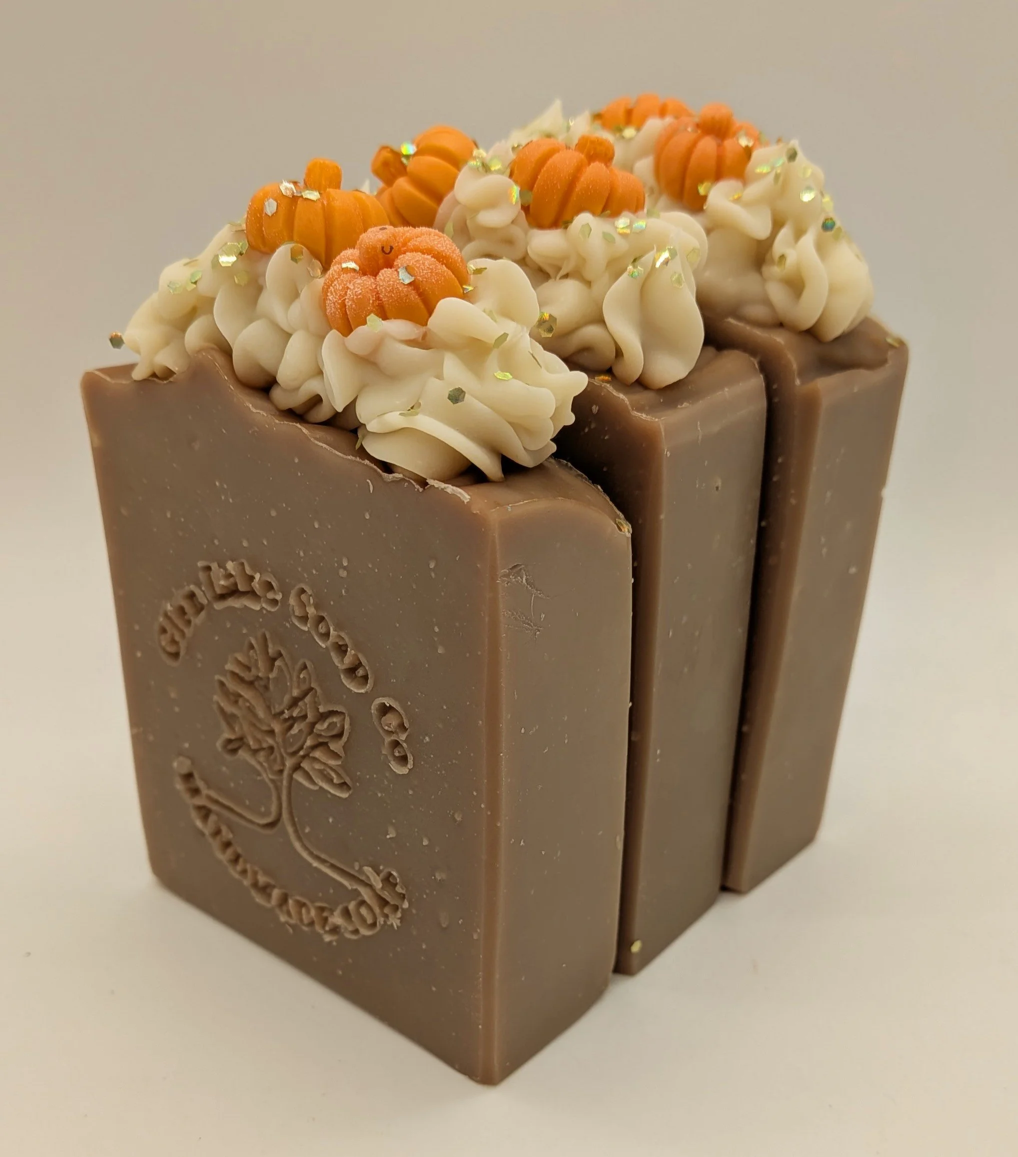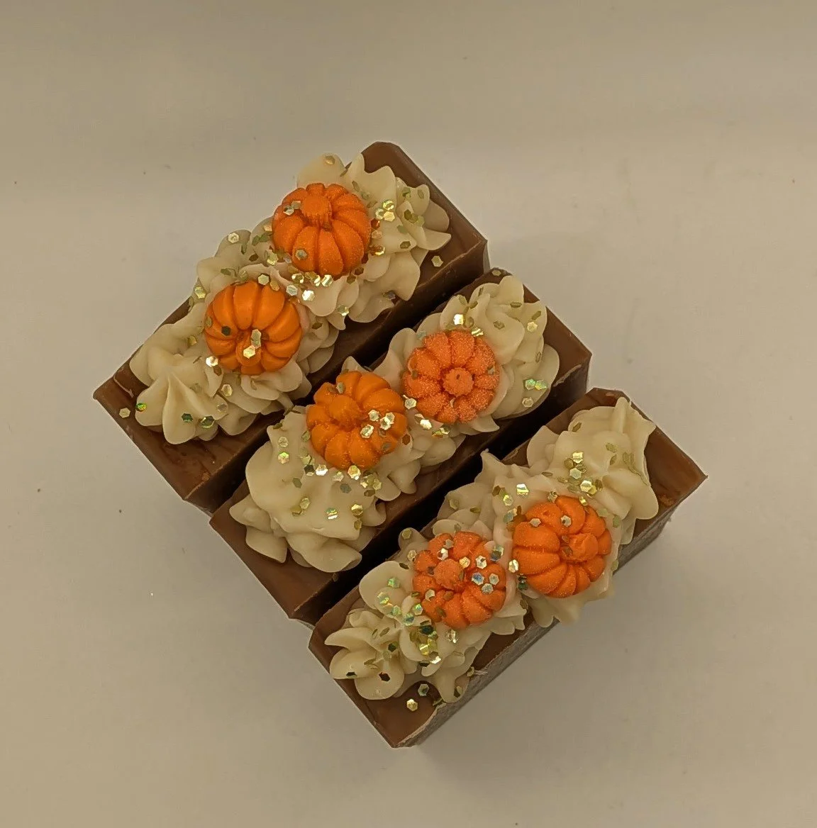 Our Pumpkin Apple Butter bar soap has a rich aroma of apple, citrus, pear, pumpkin, cinnamon, vanilla, nutmeg and cloves. Every bar is beautifully topped with hand piped soap frosting and tiny little pumpkins. There is also a light dusting of biodegradable gold glitter. This is a great bar to give as a gift or simply for yourself.