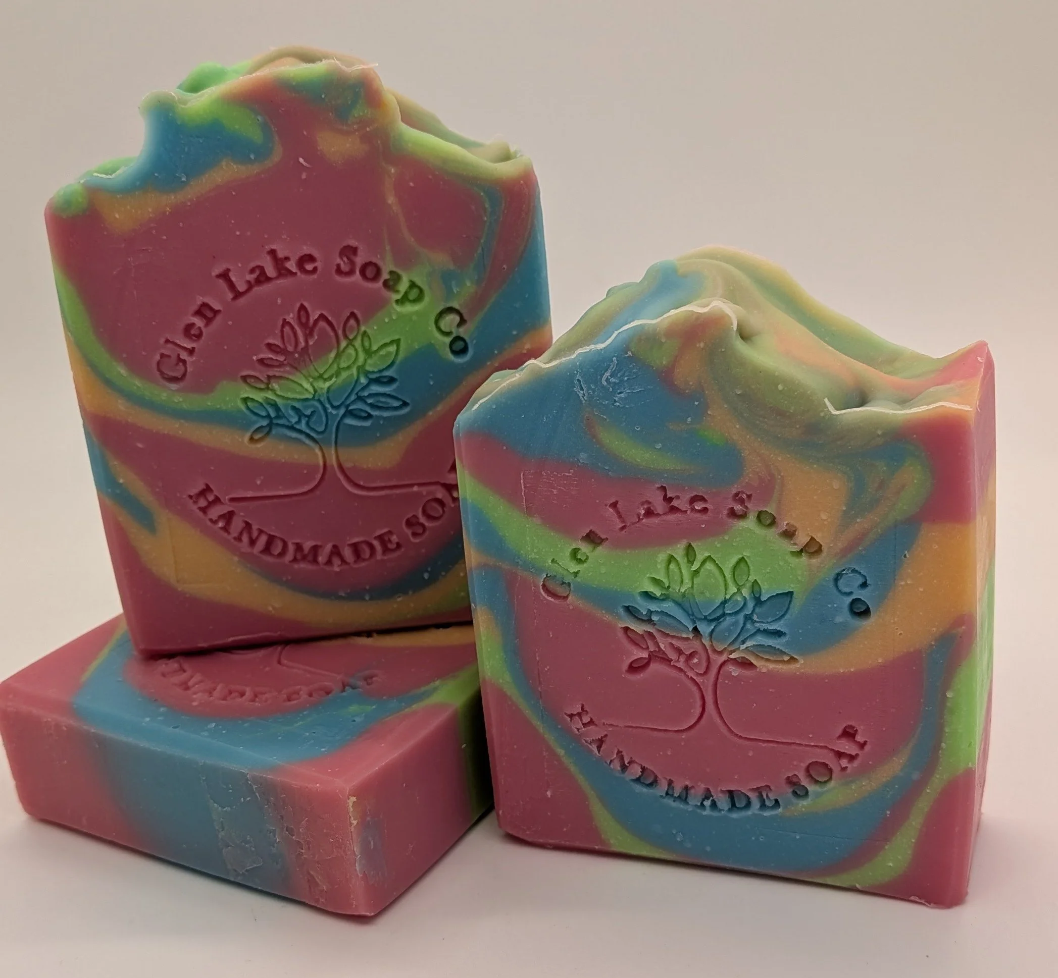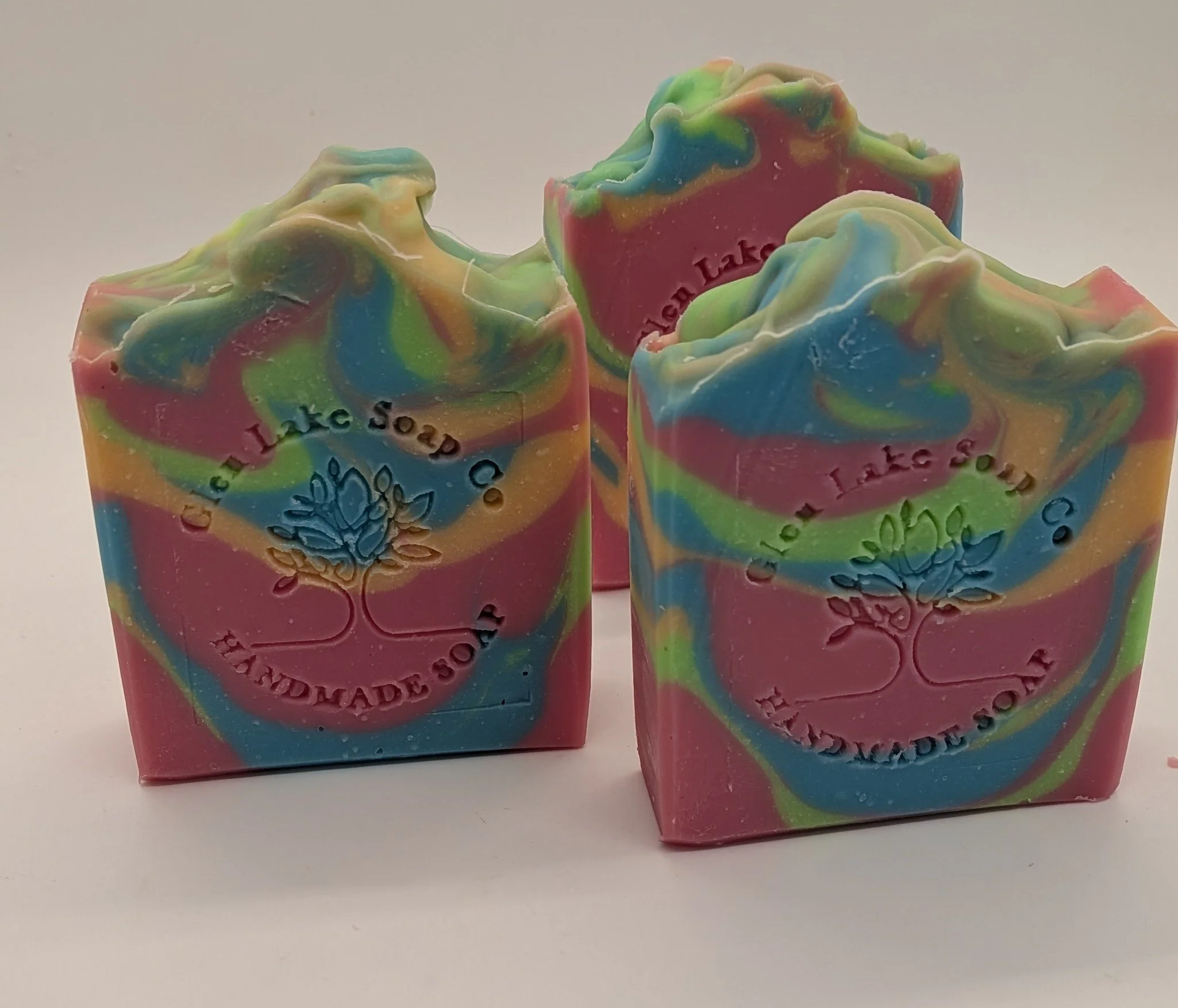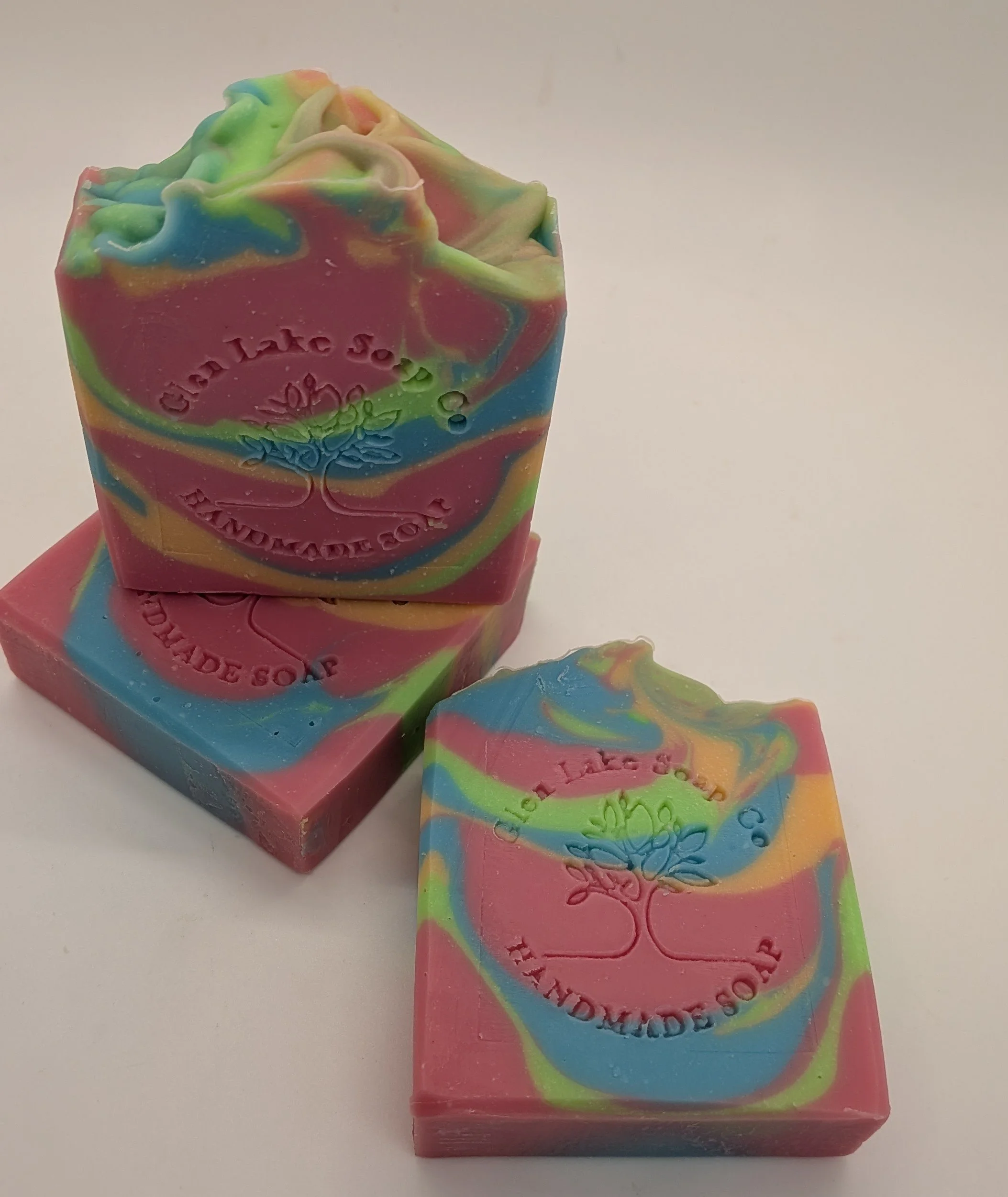 Our Rainbow Sherbert bar soap smells simply delicious. It has the aroma of lime, pineapple, orange, raspberry and vanilla.