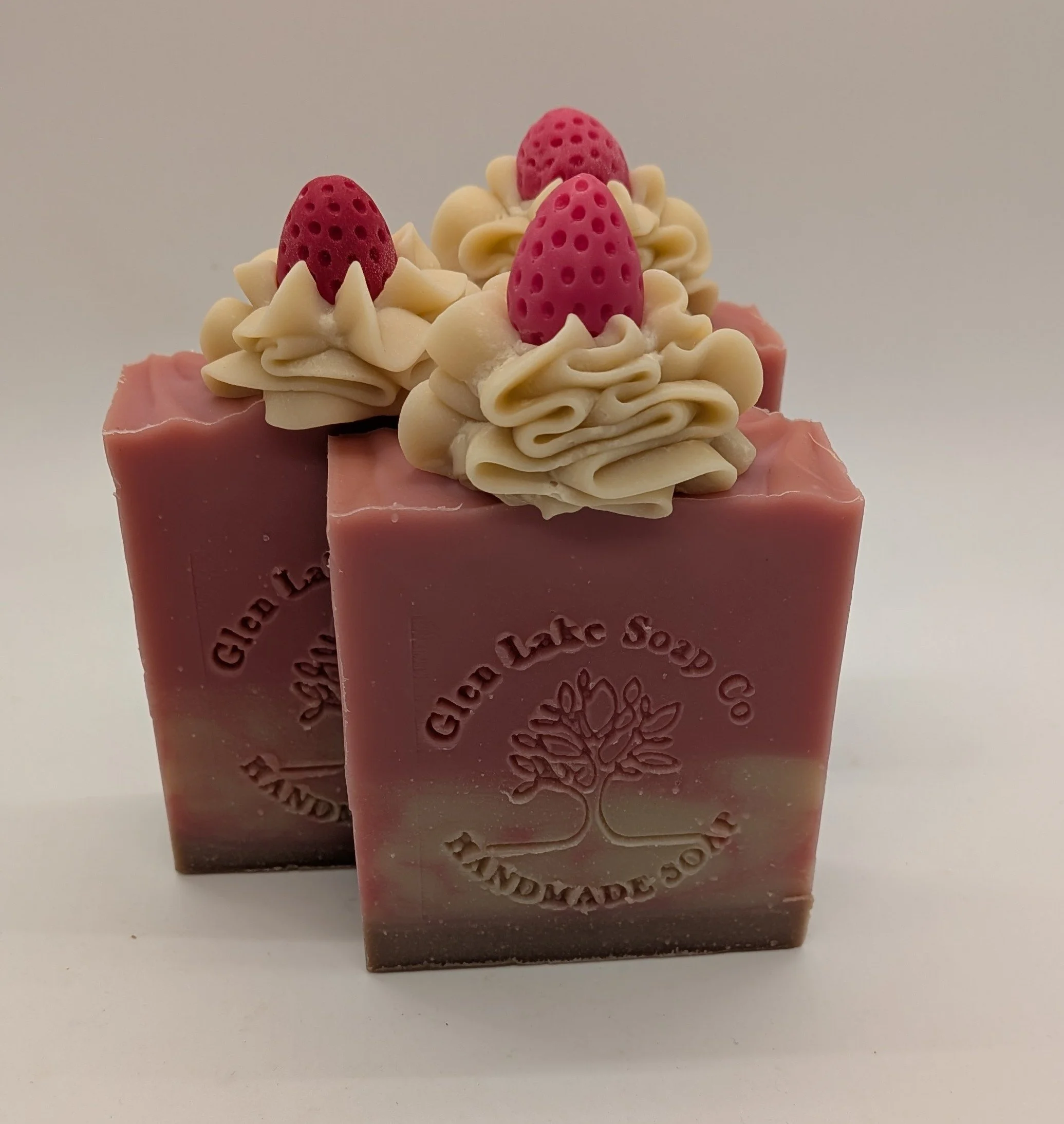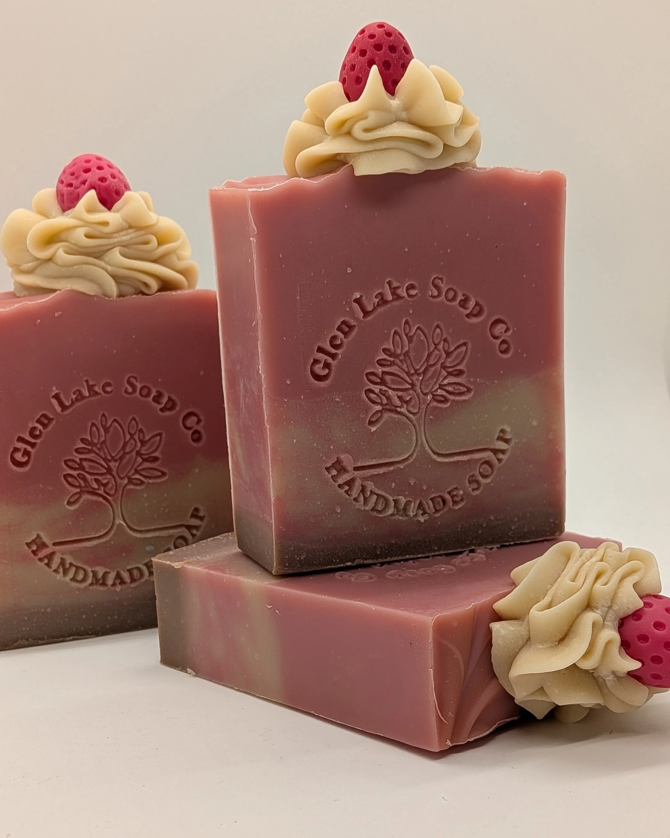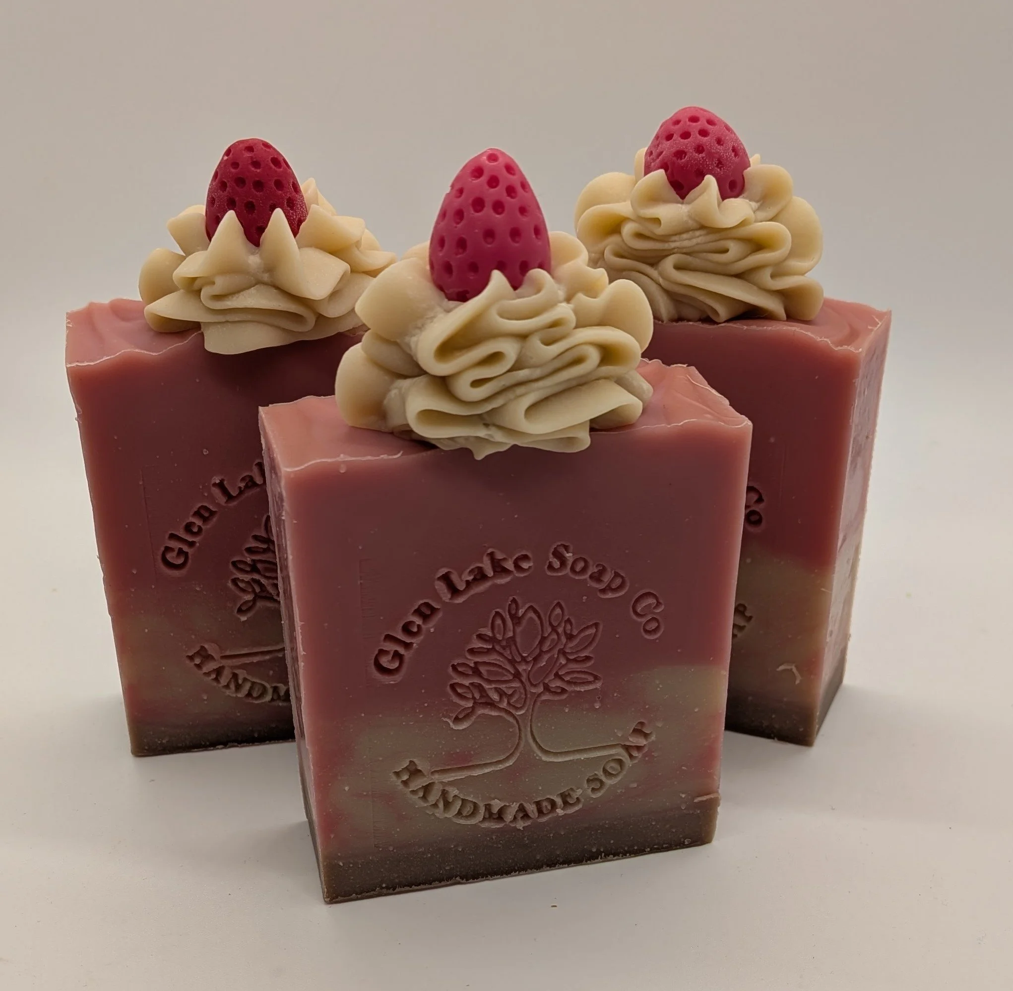 This Strawberry Cheesecake bar soap has the delicious aroma of rich and creamy cheesecake that is topped with a delicious and sweet strawberry topping. Each bar weighs 4.25-5 oz’s each and is topped with hand piped soap topping and soap strawberries. It will be hard to remember that this is soap and not the real thing!