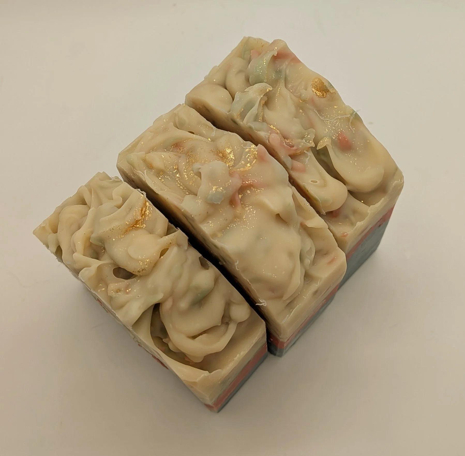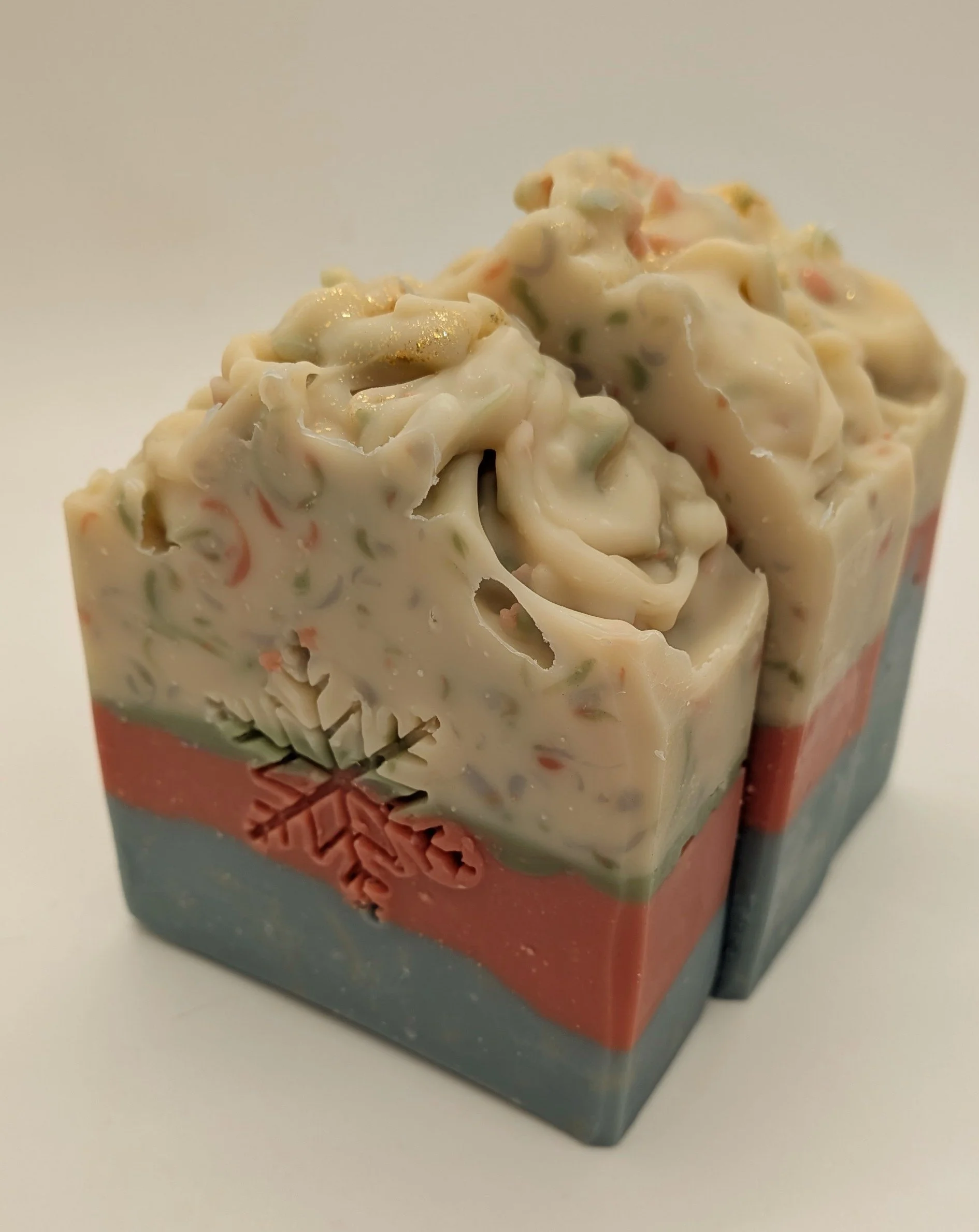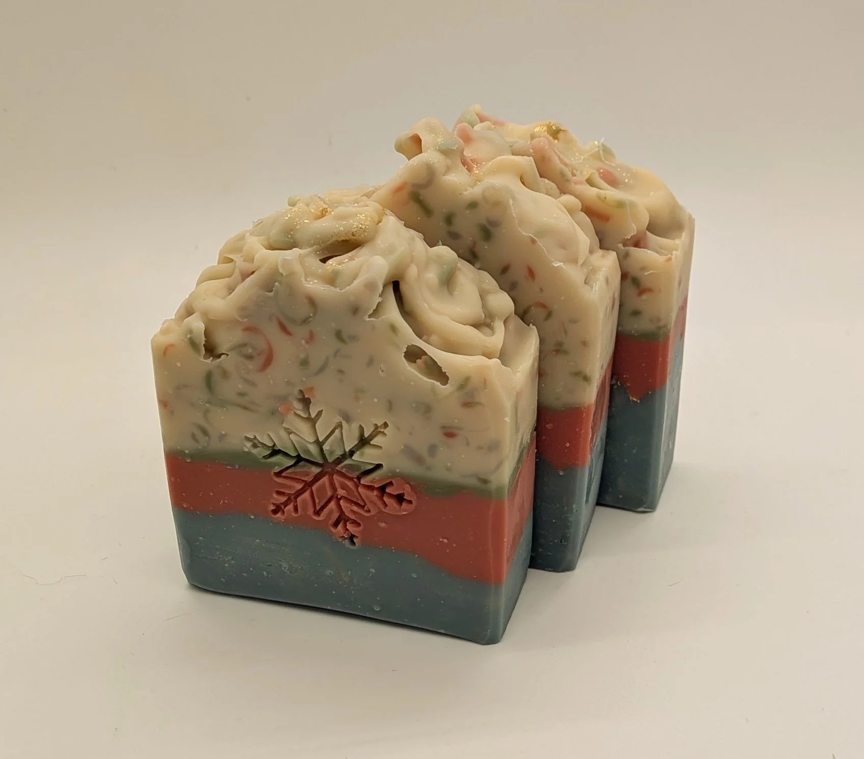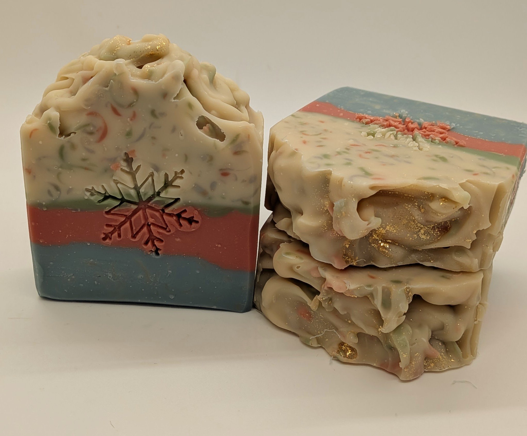 Ugly Christmas Sweater bar soap is scented with Orange Zest, Apples, Pineapple, Mulled Apple Cider, Cool Mint, Cedarwood, Cinnamon and Clove.