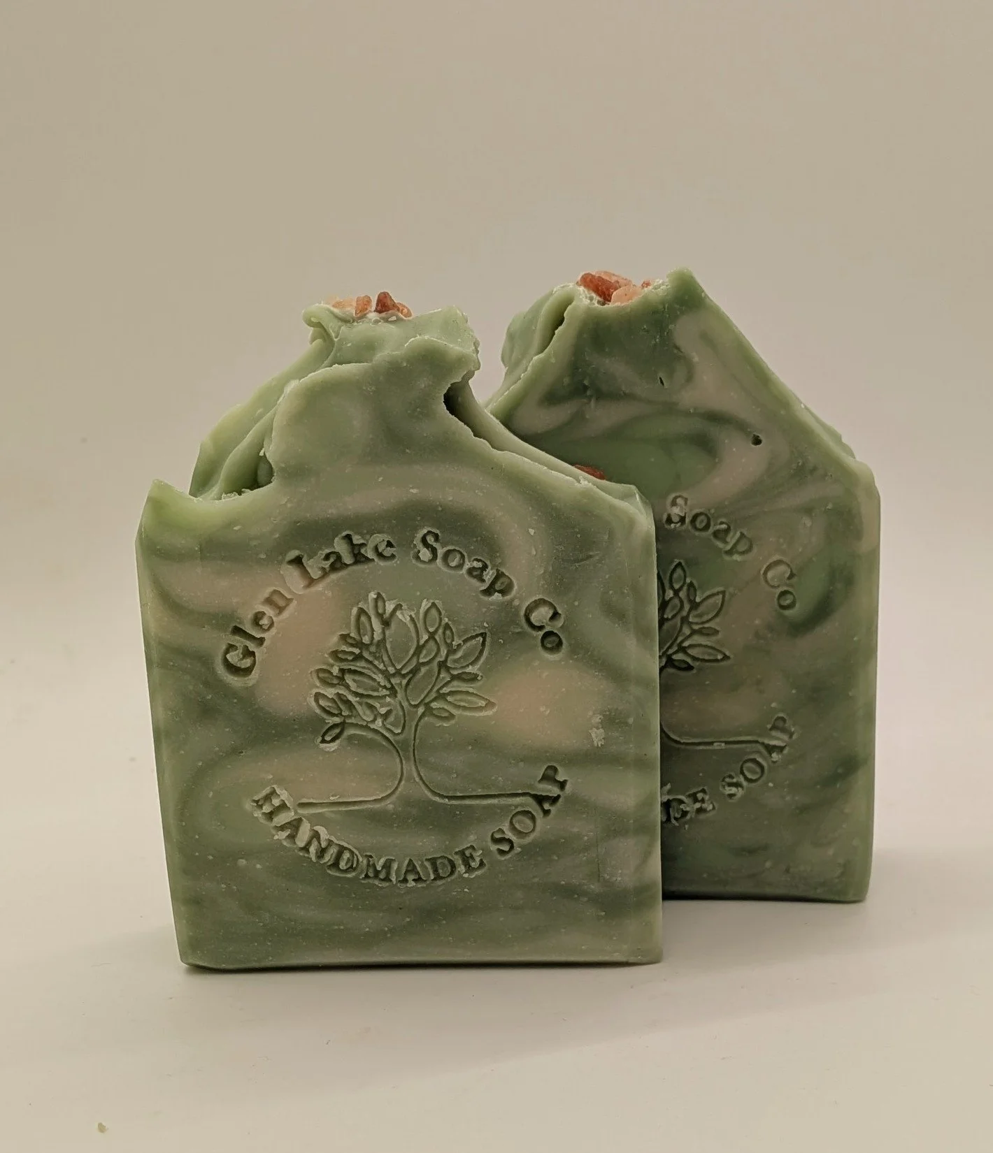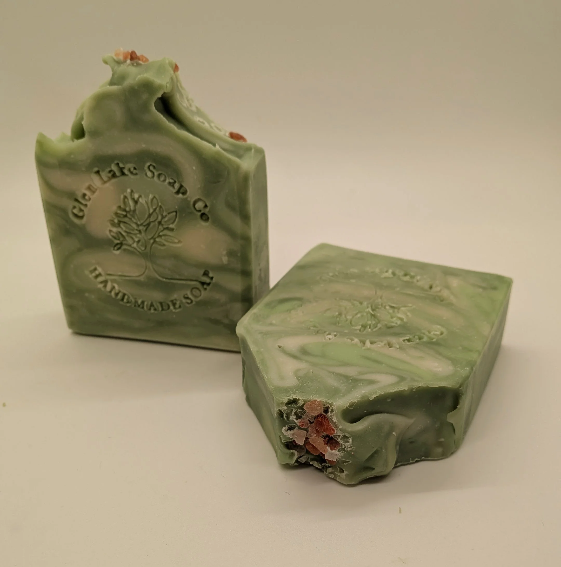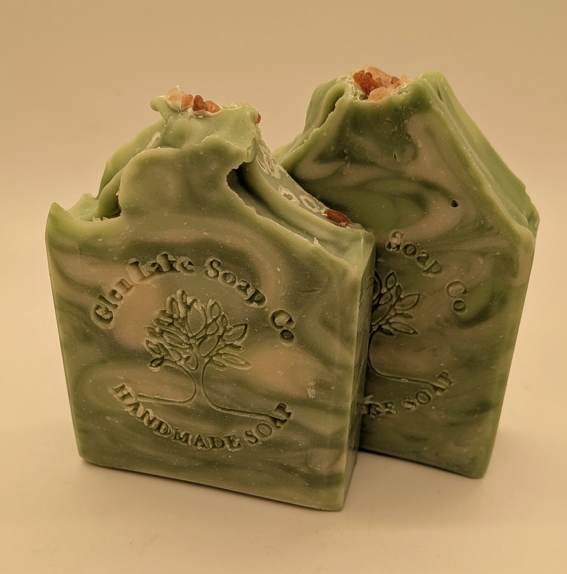 Our Wicked bar soap is a green swirled bar of soap that is topped with Pink Himalayan Salt. It has a bright citrus fragrance of mandarin oranges, lemons and pineapple.